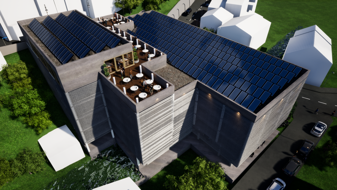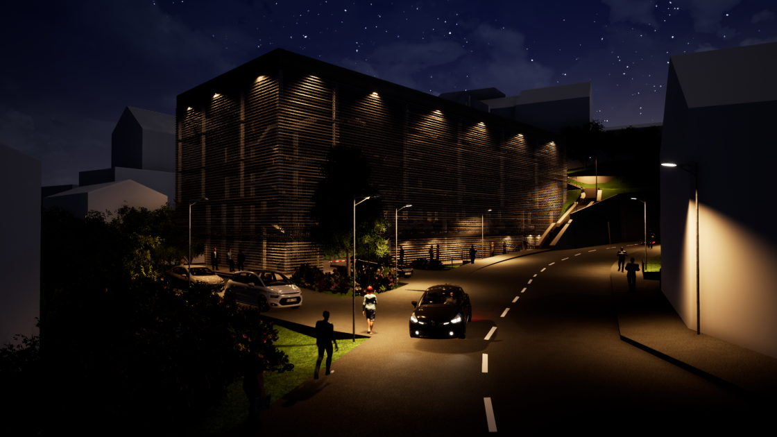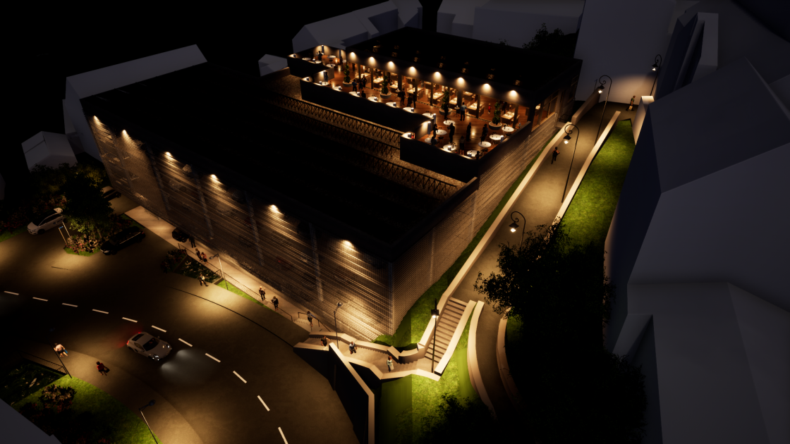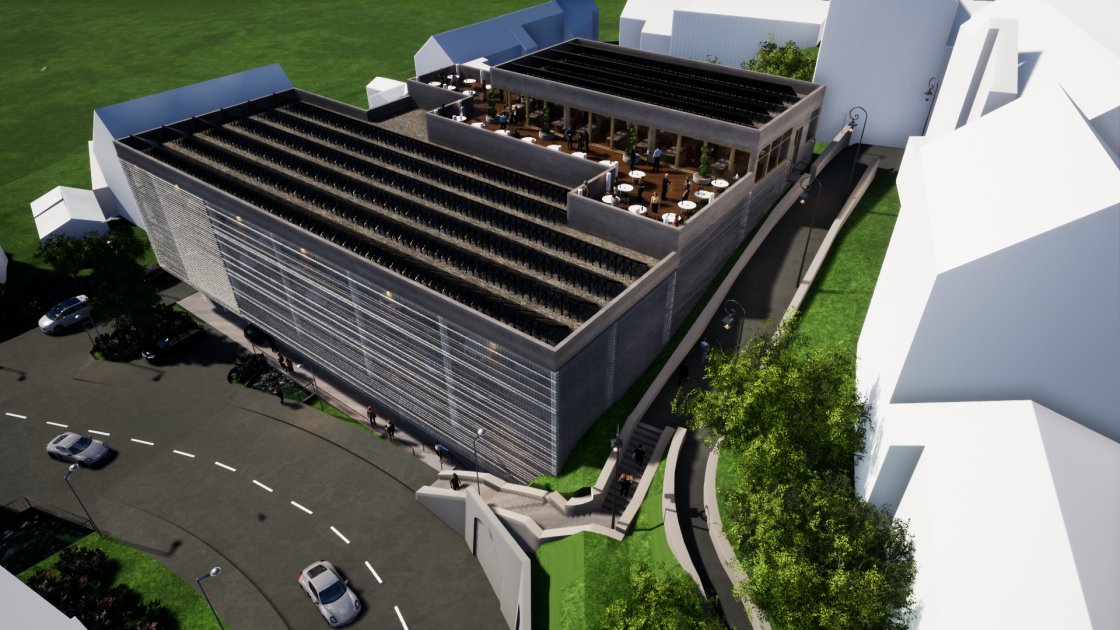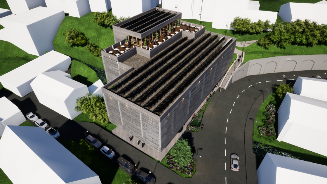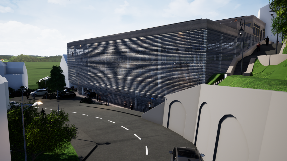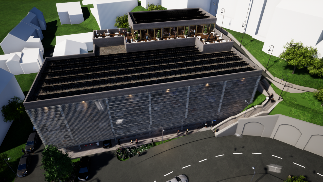 Ende 2018 haben wir das Fassaden-Konzept für ein Parkhaus vor der Altstadt von Traunstein übernommen und hierzu den Entwurf und eine Visualisierung gemacht. Das Parkhaus wird mit 223 Parkplätzen auf sechs Ebenen die Innenstadt vom Verkehr entlasten. Ein Aufzug wird die Besucher nach oben bringen – unter anderem in das neue Restaurant, das auf der obersten Etage entsteht. Weil der Lift die Leute zugleich von der Unter- in die Oberstadt befördert, macht er einen barrierefreien Zugang zur Altstadt möglich und erfüllt so auch eine wichtige städtebauliche Funktion. Das Bauvorhaben als Ganzes leistet einen Beitrag zur Revitalisierung der Altstadt. Das Gebäude selbst wird aus einem Tragwerk von Stahl- und Betonfertigteilen bestehen, seine Fassade überformt ein Maschengewebe aus Metall. Die Dachfläche wird mit Photovoltaik-Paneelen bestückt, die der Eigenversorgung dienen und zudem Ladestationen für Elektroautos versorgen sollen.